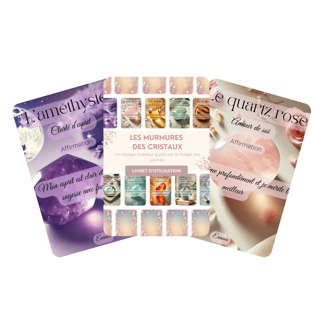 Créer Les Murmures des Cristaux est pour moi une évidence : c’est un mélange de tout ce que j’aime offrir — la beauté et la vibration des pierres, associées à la puissance des affirmations positives.