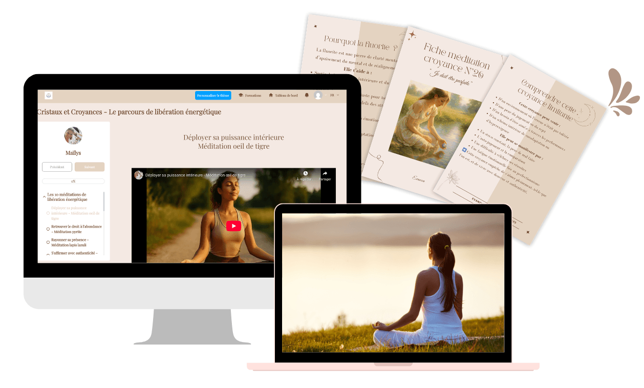 Vous y trouverez les 10 méditations guidées classées par croyance limitante et pierre associée, ainsi que les bonus. Vous pouvez commencer le jour même, avancer à votre rythme et choisir l’ordre qui vous inspire le plus.